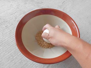 ①脱穀した籾をすり鉢に入れる。