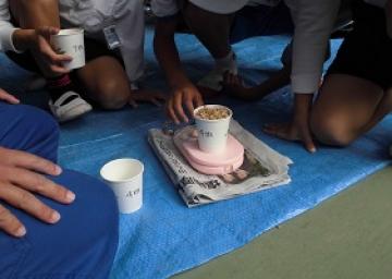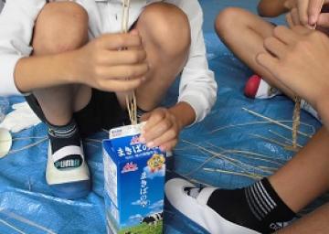 約2週間天日干しで乾燥した稲を牛乳パックを使って脱穀(だっこく)しました。