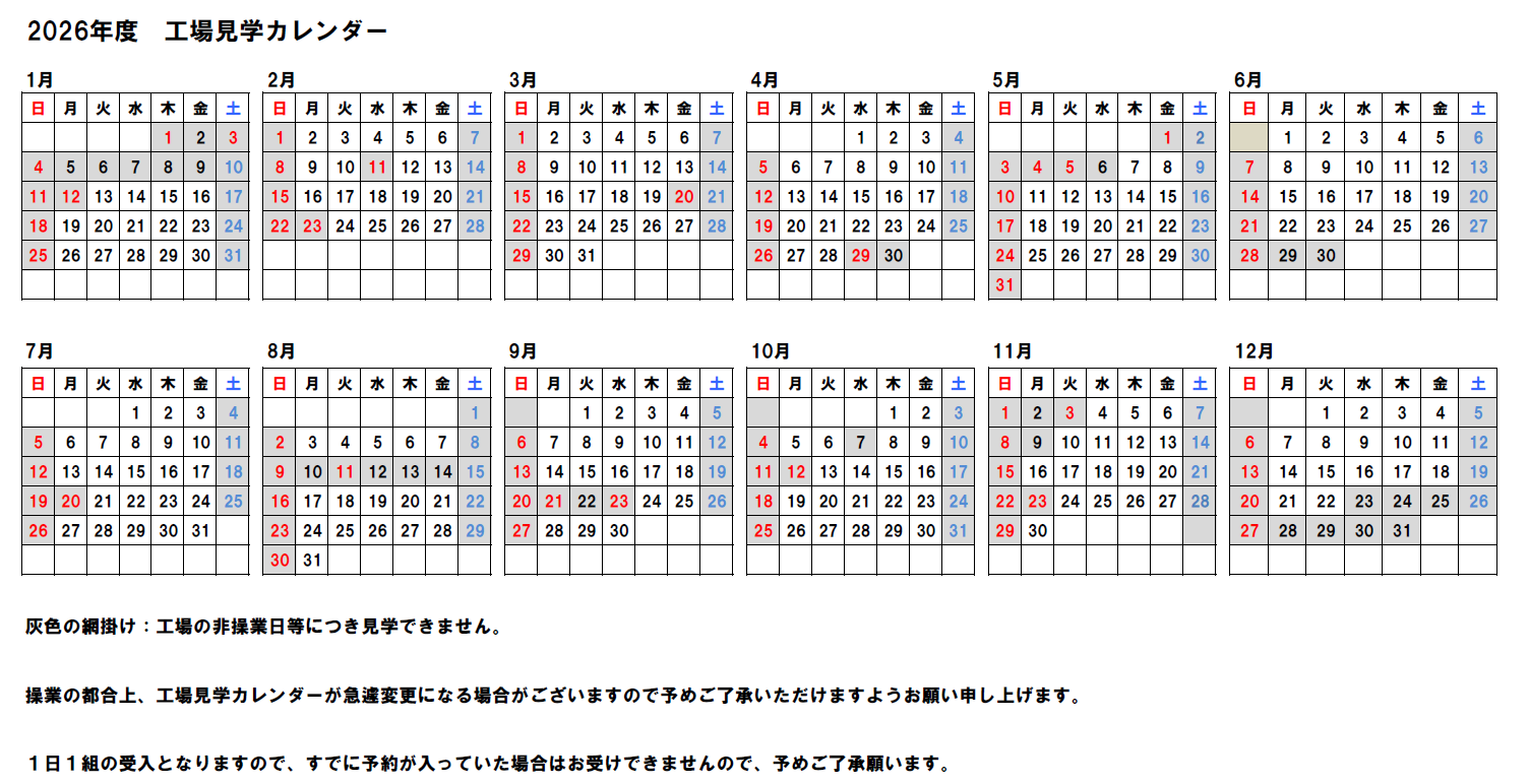 | 開催日時 | (午前入場時間)9:00~10:00まで (午後入場時間)13:30~14:30まで ※当社休業日を除く(詳細は下記工場見学カレンダーをご確認下さい。) ※操業の関係で急遽休業日に変更、又見学コースが変更になる場合もあります。その節はご了承下さい。 |